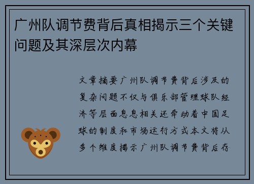 广州队调节费背后涉及的复杂问题,不仅与俱乐部管理、球队经济等层面息息相关,还牵动着中国足球的制度和市场运行方式。本文将从多个维度揭示广州队调节费背后存在的深层次内幕,围绕三个关键问题展开探讨:俱乐部的财政困境、制度的漏洞、以及市场和监管的失衡。这些问题不仅影响着广州队自身的发展,也深刻影响着中国足球的未来走向。通过分析广州队在调节费过程中遭遇的困境与应对策略,本文将进一步讨论这些问题对足球行业、俱乐部及球员等各方的深远影响。最后,本文会就如何解决这些问题提出一些思考,旨在推动中国足球管理体系的进一步完善。